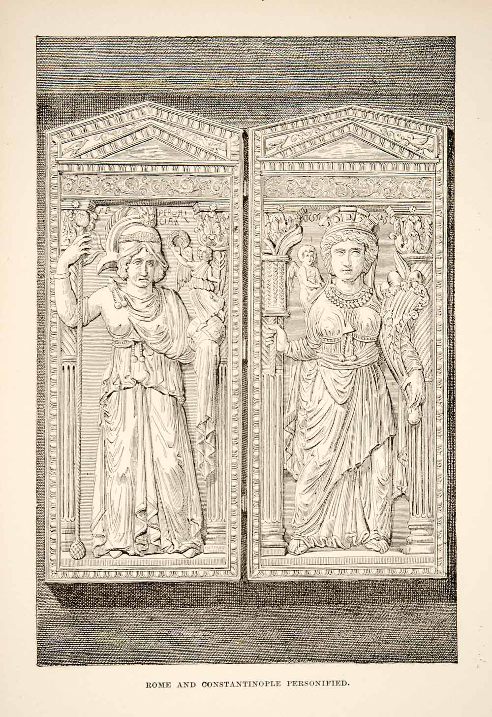 This is an original 1890 black and white relief line-block print of a diptych of the cities of Rome and Constantinople personified as women. This relief sculpture was probably created in late ancient Roman times.