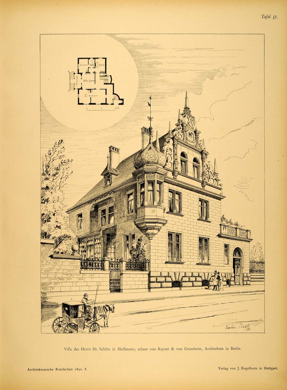 This is an original 1890 halftone print of an architectural drawing, with floor plan, of a house in Heilbronn, Germany. Architects: Kayser & Grossheim.