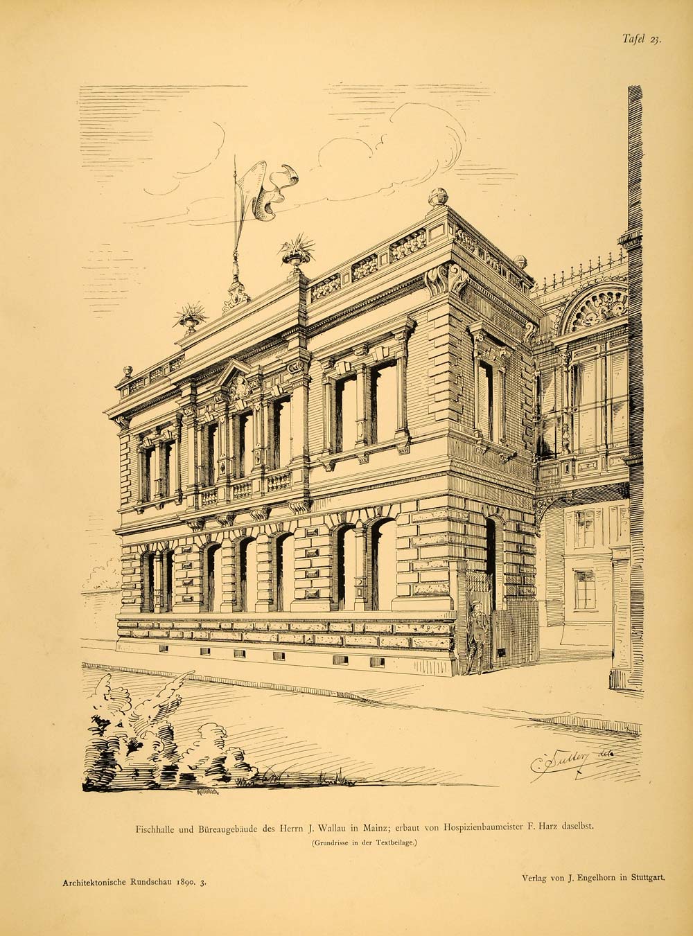 This is an original 1890 halftone print of an architectural drawing of a building in Mainz, Germany. Architect: F. Harz.
