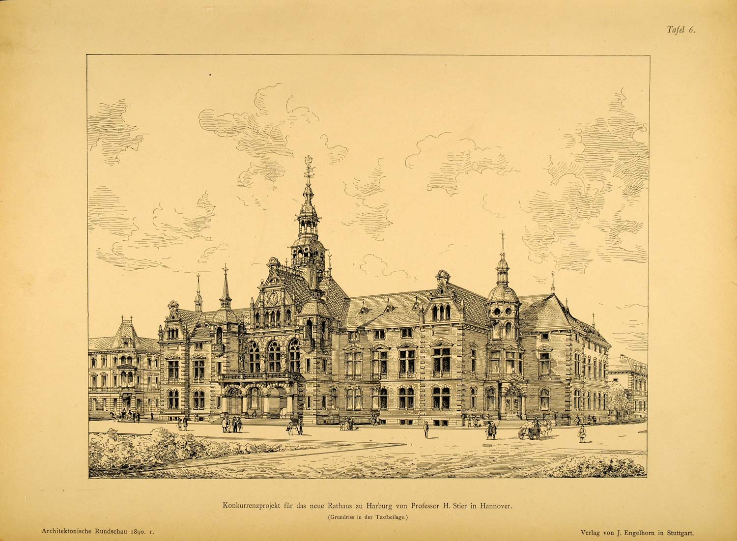 This is an original 1890 halftone print of an architectural drawing for the proposed new Rathaus in Harburg, Germany. Architect: Professor H. Stier of Hannover.