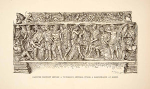 This is an original 1890 black and white relief line-block print of a relief sculpture showing prisoners being brought before a victorious Roman general from a sarcophagus at Rome, Italy.