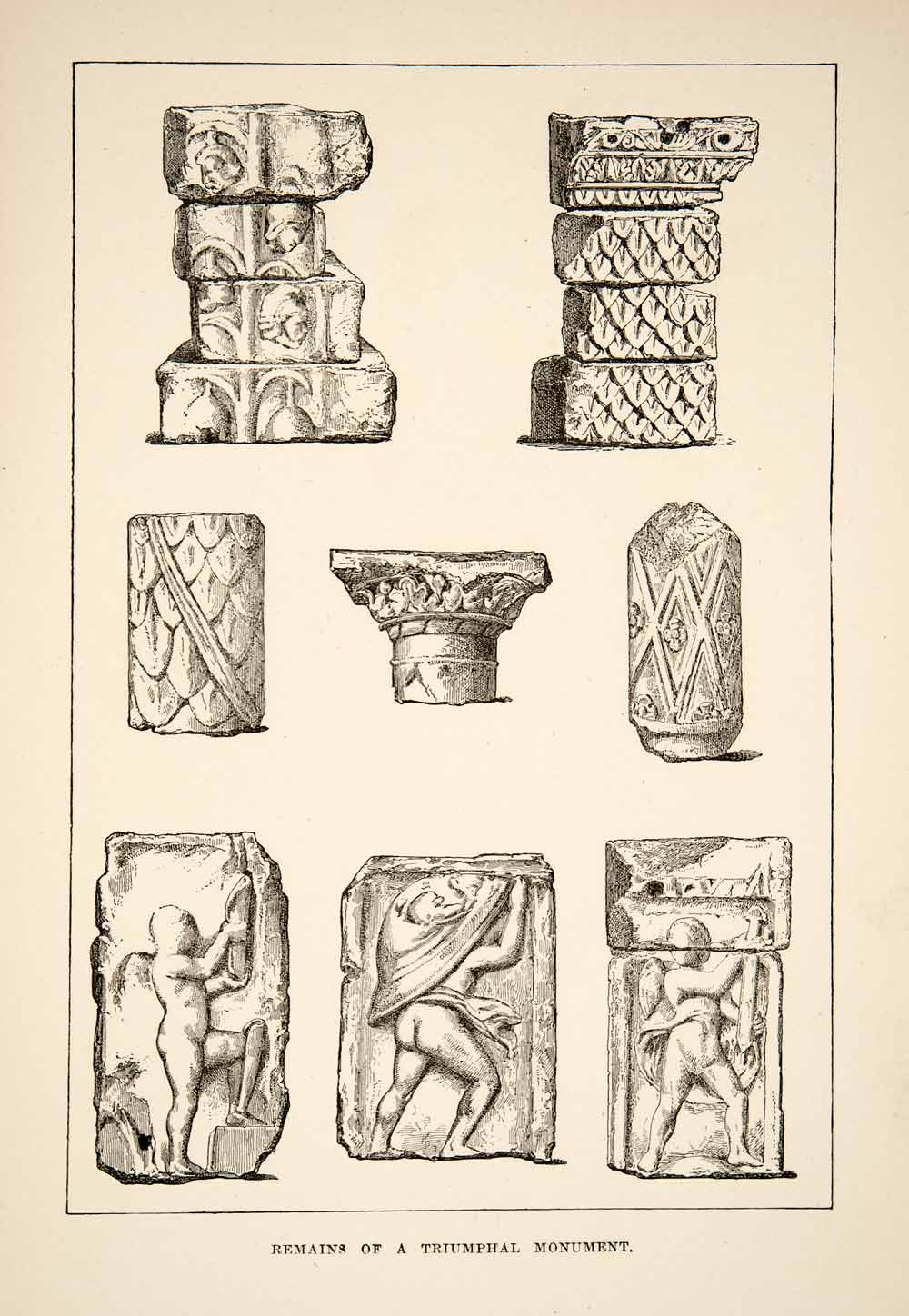 This is an original 1890 black and white relief line-block print of the remains of the relief sculptures from an ancient triumphal monument. The pieces in the print are probably Roman or Byzantine.