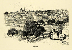 This is an original 1890 black and white wood engraving of a view of ancient Bethany, near Jerusalem in Israel. It is said that this holy village housed the tomb of Lazarus, as well as served as home to Mary, Martha and Simon the Leper, according to the New Testament. Bethany also lodged Jesus after his entry into Jerusalem.