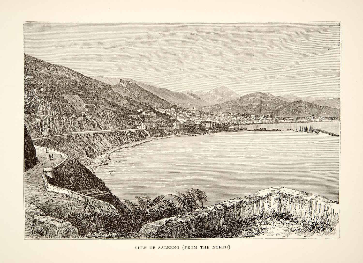 1890 Wood Engraving Ancient Salerno Italy Gulf Harbor Cityscape Landscape XHB2