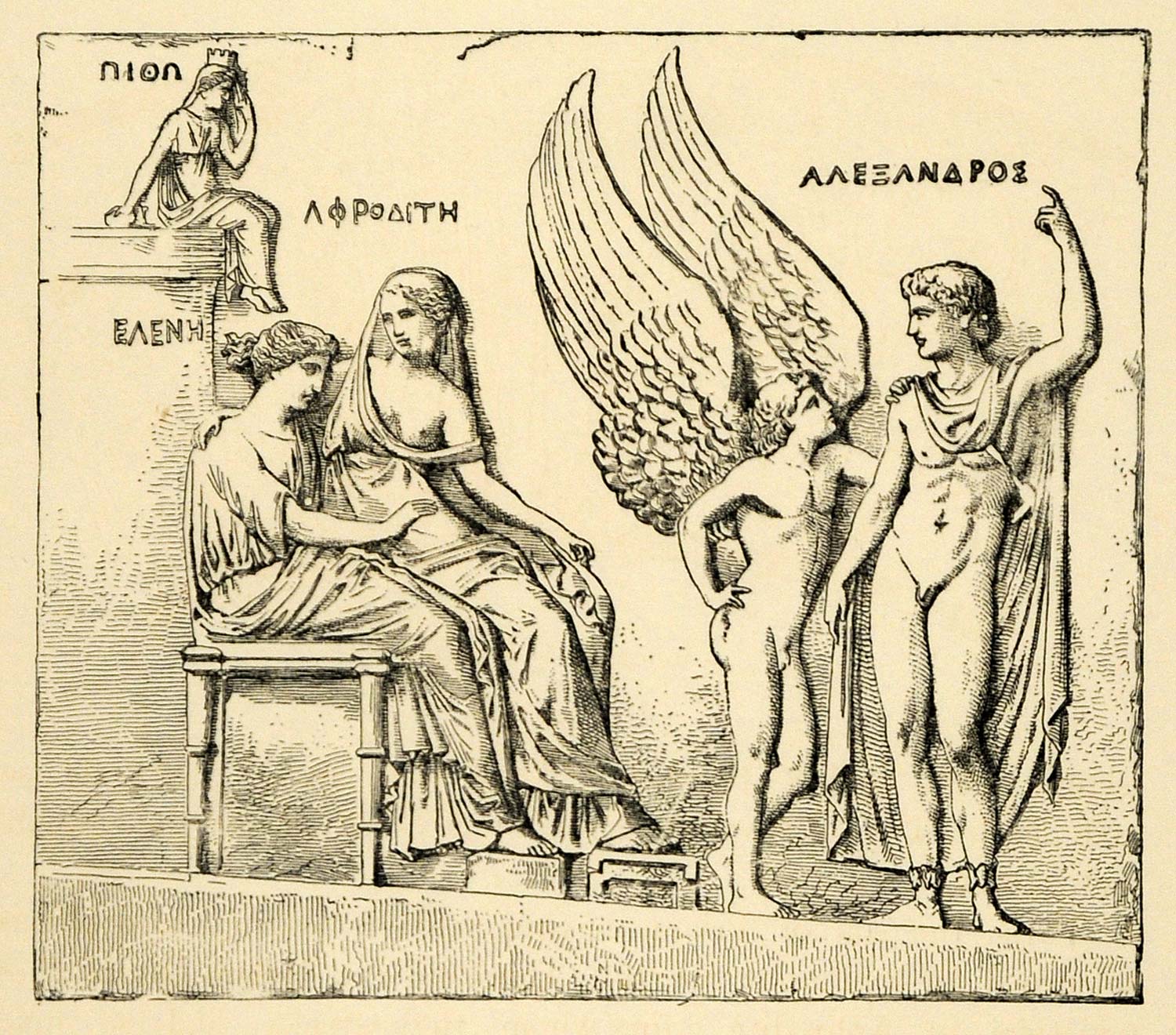 This is an original 1890 black and white wood engraving of Helen, Paris, and Love, Aphrodite and Persuasion. This image was taken from a bas-relief from ancient Greece.
