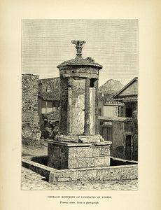 This is an original 1890 black and white wood engraving of the Choragic Monument of Lysicrates, located near the acropolis of Athens, Greece. The monument was erected by Lysicrates, a patron of the performances of the Theatre of Dionysus, to commemorate a first prize award in 335 BC.
