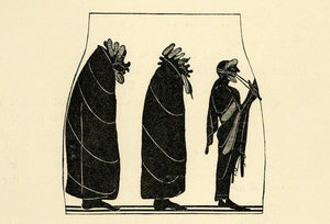 This is a small original 1890 black and white wood engraving of two figures with the heads of roosters following a man playing the double flute. The image came from an ancient Greek vase painting.