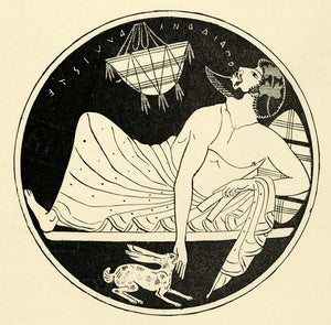 This is an original 1890 black and white wood engraving of a man holding castanets in one hand and stroking a rabbit with the other. This image came from a painting inside an ancient Greek cup from Tanagra.