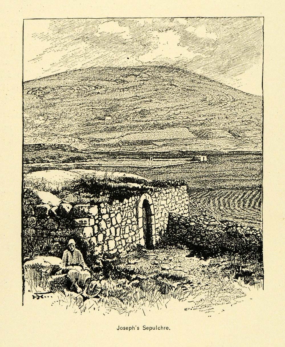 This is an original 1890 black and white wood engraving of Joseph's Sepulchre (also referred to as the Tomb of Joseph of Arimathea or the Church of the Holy Sepulcher) in Jerusalem, Israel. The most compelling evidence points to this location as to where Jesus Christ was actually buried.