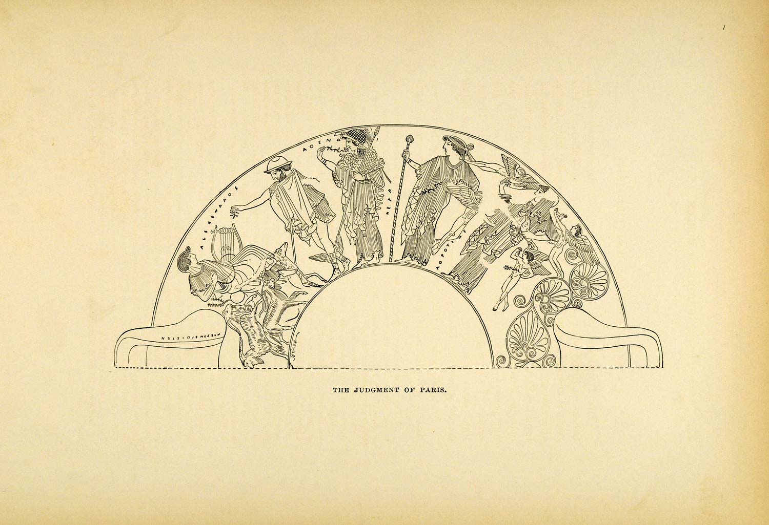 This is an original 1890 black and white wood engraving of the judgment of Paris represented on a painting from a vase of Hiero, featuring Alexandros, Hermes, Athena, and Aphrodite.