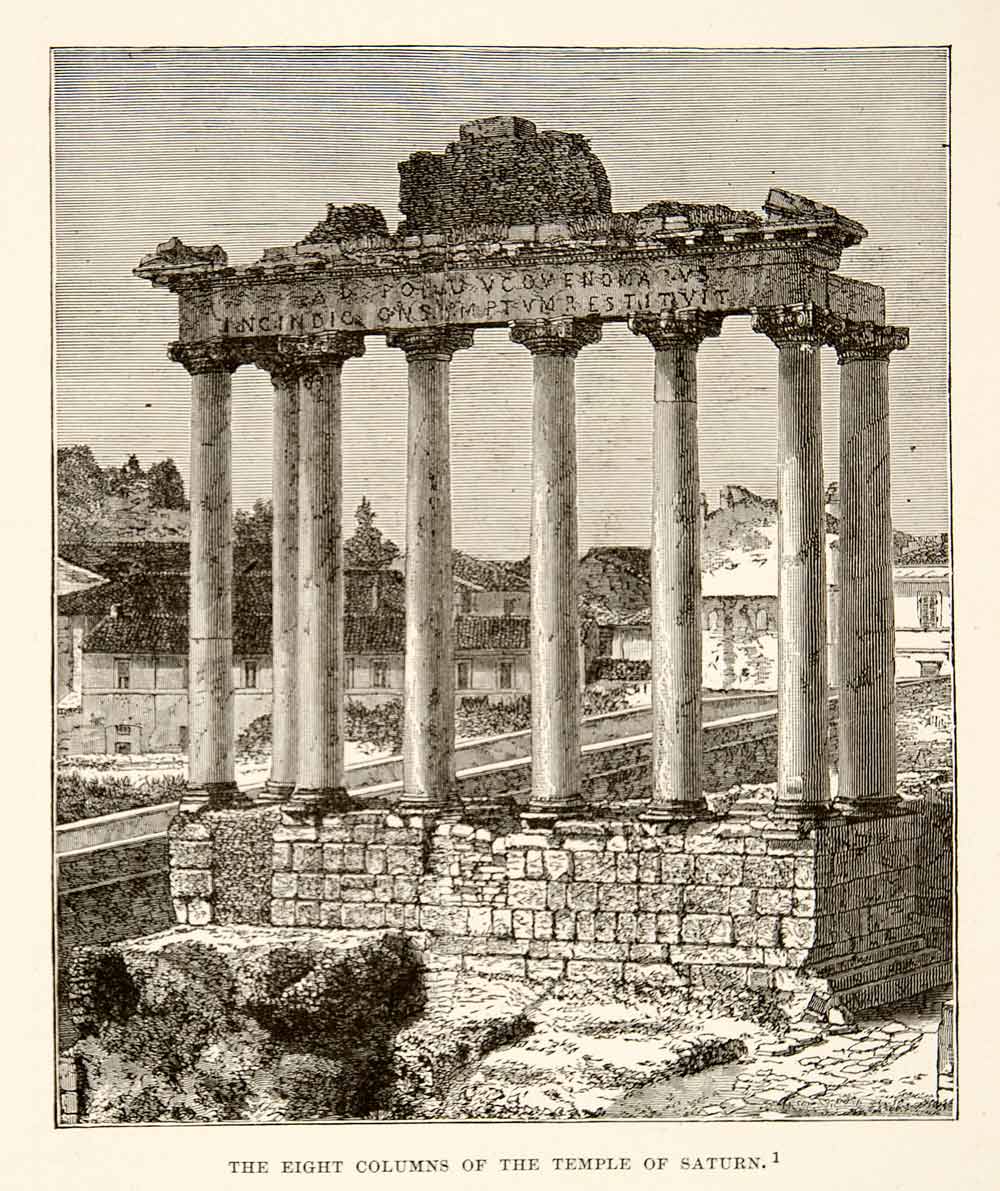 1890 Wood Engraving (Photoxylograph) Ancient Temple Saturn Ruins Rome Italy XHB2