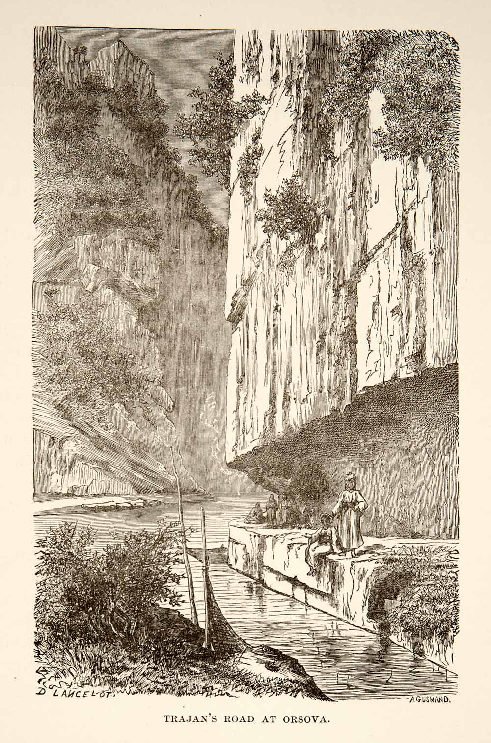 This is an original 1890 black and white in-text wood engraving of a road named after ancient Roman Emperor Trajan near the city of Orsova, Romania. Orsova is a port city along the Danube river.