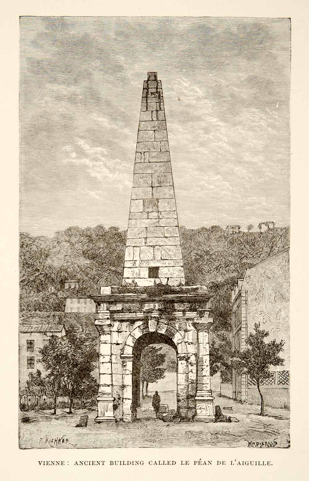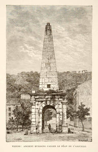 This is an original 1890 black and white in-text wood engraving of an ancient Roman building called "Le Péan de L'Aiguille" which we believe may be located in Vienna, Austria.