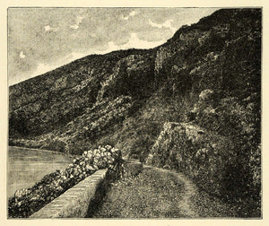 This is an original 1890 black and white wood engraving of the road between Megara and Corinth, Greece, featuring the skironian rocks.