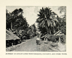 This is an original 1890 black and white in-text wood engraving of a street in Ceylon (Sri Lanka) with Tamarind, cocoanut, and other trees.