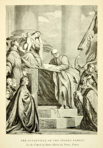 This is an original 1890 black and white wood engraving of an Italian Renaissance painting by Titian entitled the Pesaro Madonna or the Madonna di Ca'Pesaro that portrayed the Virgin Mary holding the Christ child with Saint Peter to her right.