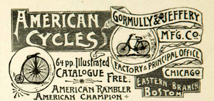 This is an original 1891 black and white print ad for American Cycles from the Gormully and Jeffery Manufacturing Company in Boston and Chicago.