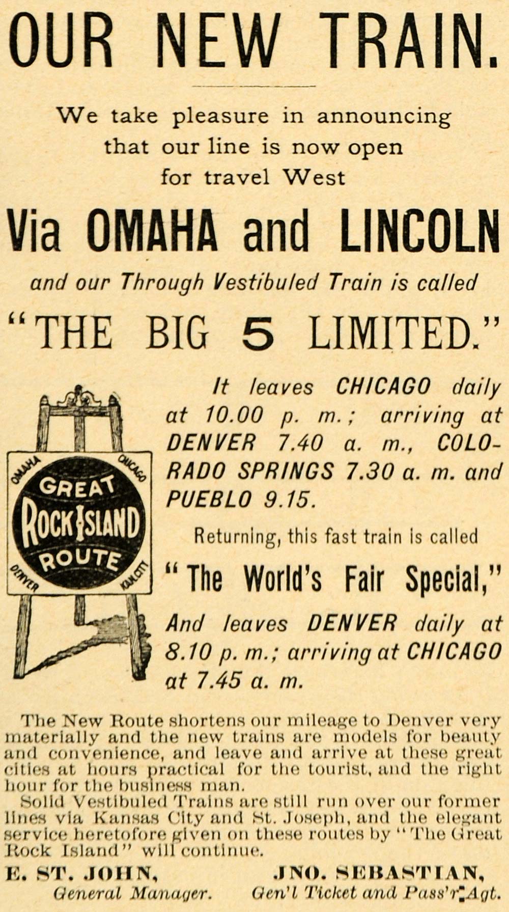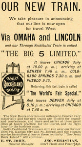 This is a small original 1891 black and white print ad for The Big 5 Limited trains on the Great Rock Island Route.