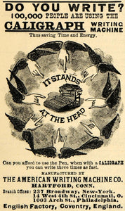 This is an original 1891 black and white print ad for the Caligraph Writing Machine, a product by The American Writing Machine Company in Hartford, Connecticut. Branch offices located at 237 Broadway in New York, 14 West 4th Street in Cincinnati, Ohio and 1003 Arch Street in Philadelphia, Pennsylvania.