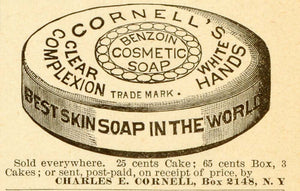 This is a tiny original 1891 black and white print ad for Charles E. Cornell's Clear Benzoin Cosmetic Soap for a clear complexion and white hands.