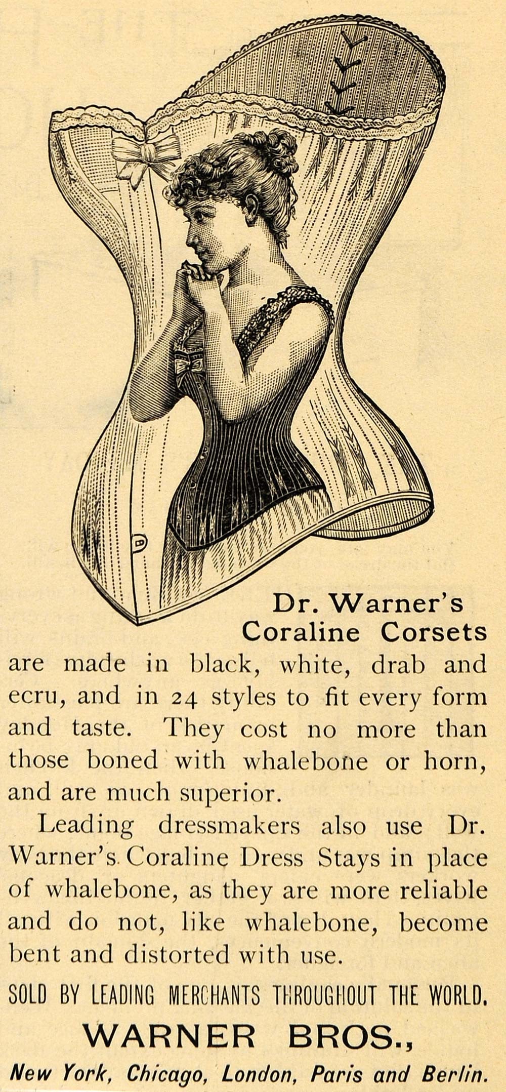This is a small original 1891 black and white print ad for Dr. Warner's Coraline Corsets and Dresses by the Warner Brothers of New York, Chicago, London, Paris and Berlin.