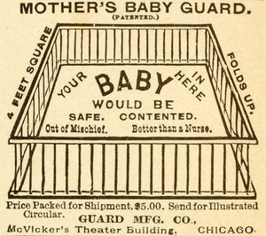 This is a small original 1891 black and white print ad for Mother's Baby Guard, a product by the Guard Manufacturing Company, located in the McVicker's Theater Building in Chicago.