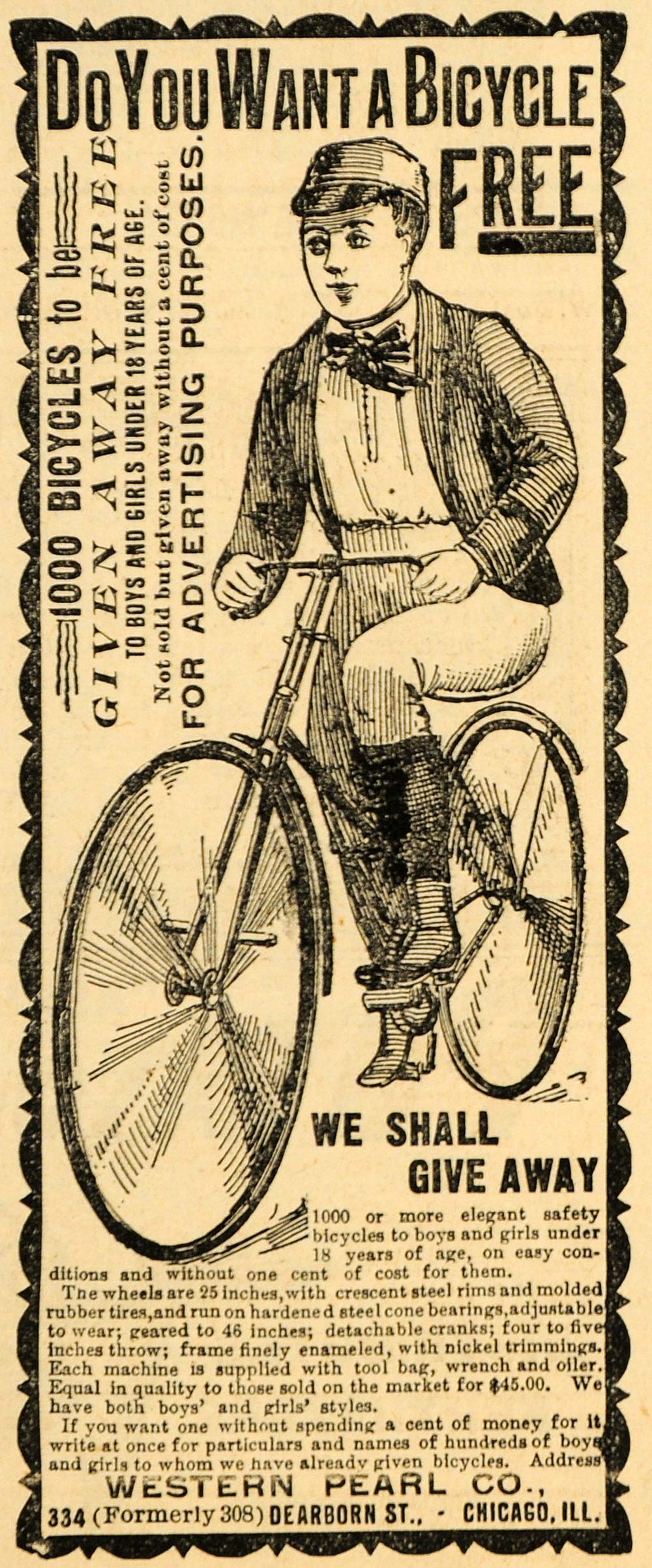 This is an original 1891 black and white print ad for the Western Pearl Company of 334 Dearborn Street in Chicago, Illinois. This ad features their bicycle giveaway for children under the age of 18.