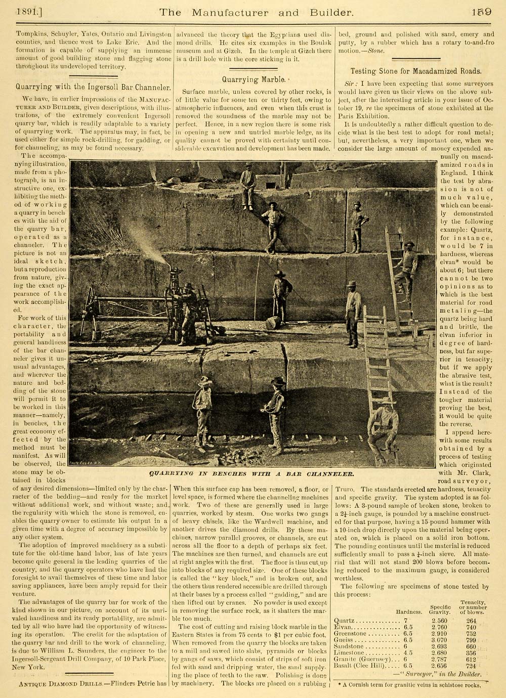 This is an original 1891 one-page print article about the Ingersoll quarry bar. This article also features an illustration of the method of working a quarry in benches with the aid of the quarry bar, operated as a channeler. The apparatus may be used either for simple rock-drilling, for gadding, or for channeling. The credit for the adaptation of the quarry bar and drill to the work of channeling is due to William L. Saunders, the engineer to the Ingersoll-Sergeant Drill Company, 10 Park Place, New York.