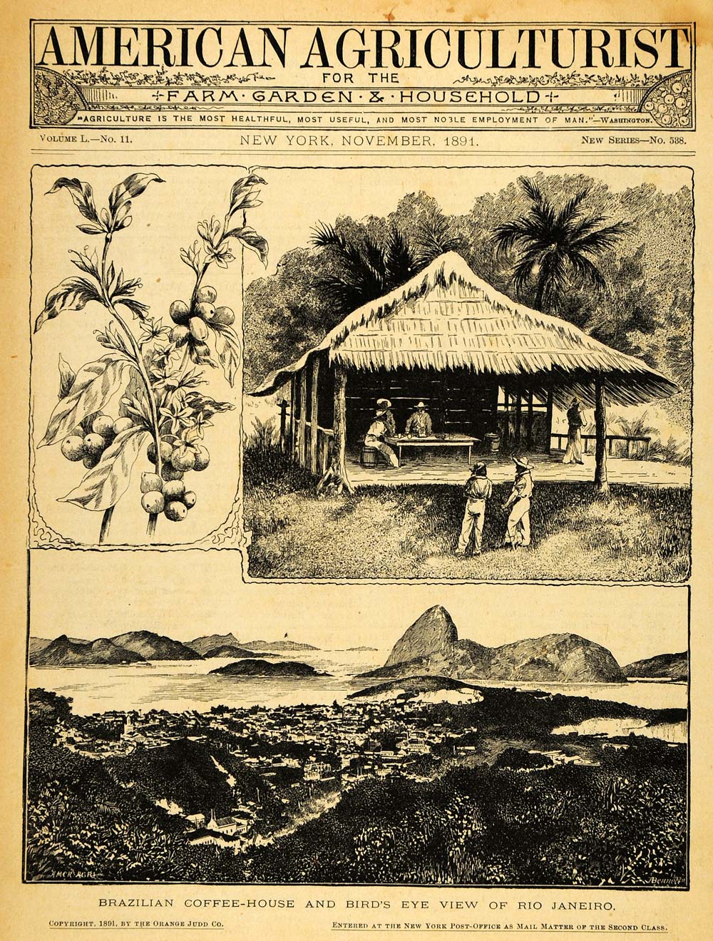 This is a rare original 1891 black and white cover for the November issue of American Agriculturist, featuring images by Bennett of a Brazilian Coffee House, as well as an aerial view of Rio Janeiro, with artwork by Bennett.CONDITION