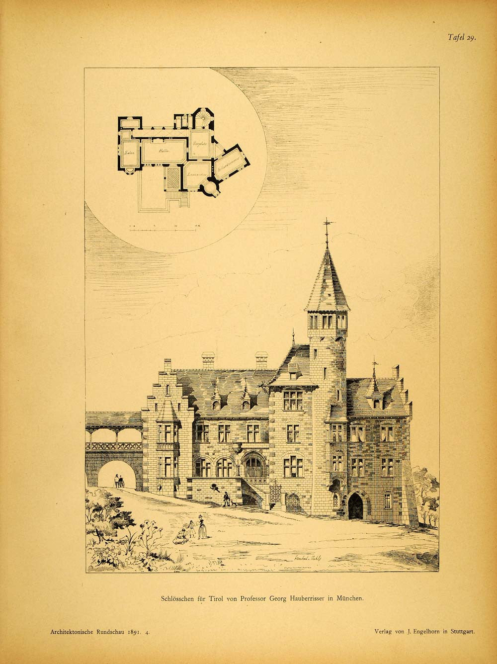 This is an original 1891 halftone print of an architectural drawing, including a floor plan, of a castle in the Tyrol. Architect: Georg Hauberrisser.