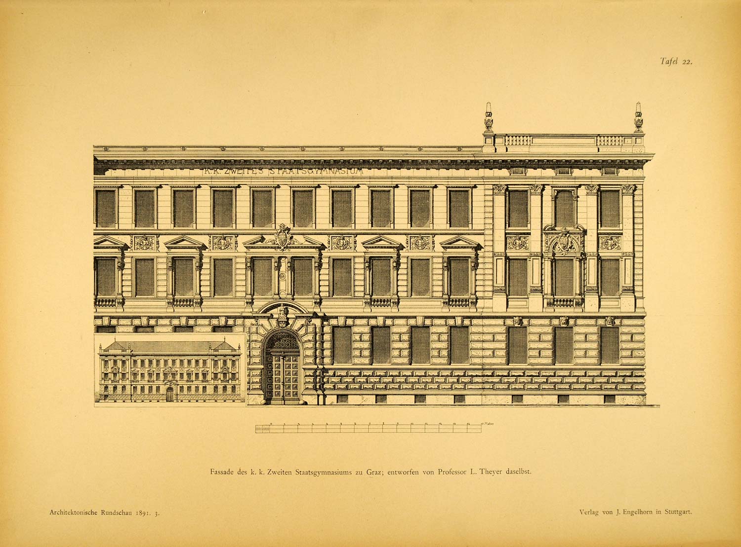 This is an original 1891 halftone print of an architectural drawing of the facade of a high school building in Graz, Austria.
