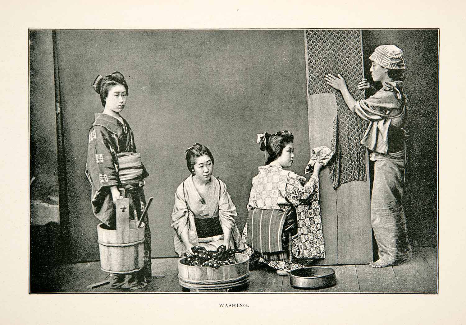 This is an original 1891 black and white halftone print of four women washing clothing in Meiji Period Japan.
