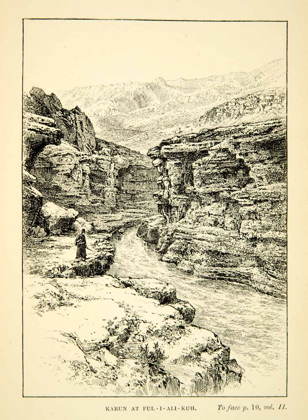 This is an original 1891 black and white relief line-block print of the Karun River at Pul-i-ali-Kuh in the Middle East. A man stands in the deep gorge, looking down at the river flowing below.