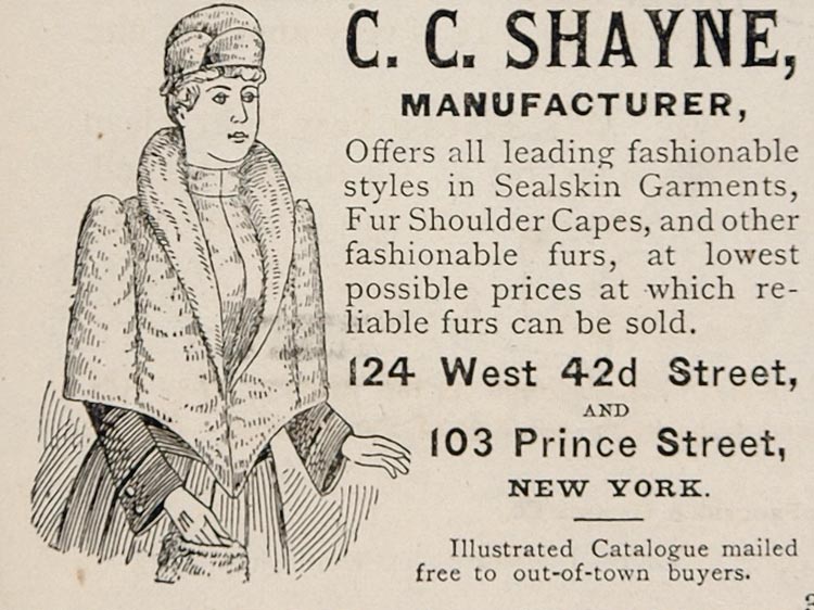 This is an original 1891 black and white print ad for Sealskin Fur Shoulder Capes and other fashionable fur garments from C. C. Shayne, Manufacturer, 124 West 42nd Street and 103 Prince Street, New York City.