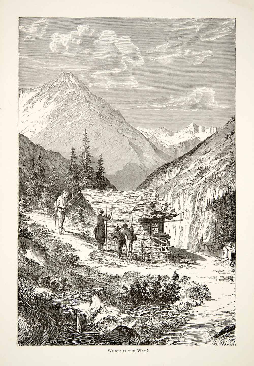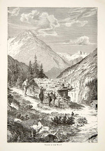 1891 Wood Engraving Alps Mountain Trail Hiker Climber Chalet Cabin XGSB1
