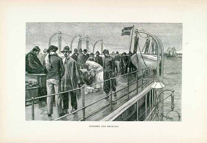 This is an original 1891 black and white wood engraving of Argentine soldiers and recruits on a ship at Rosario de Santa Fe on the Paran‡ River in Argentina.