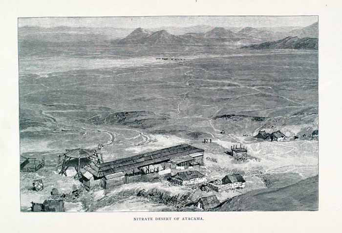 This is an original 1891 black and white wood engraving of the Atacama Desert in Chile.
