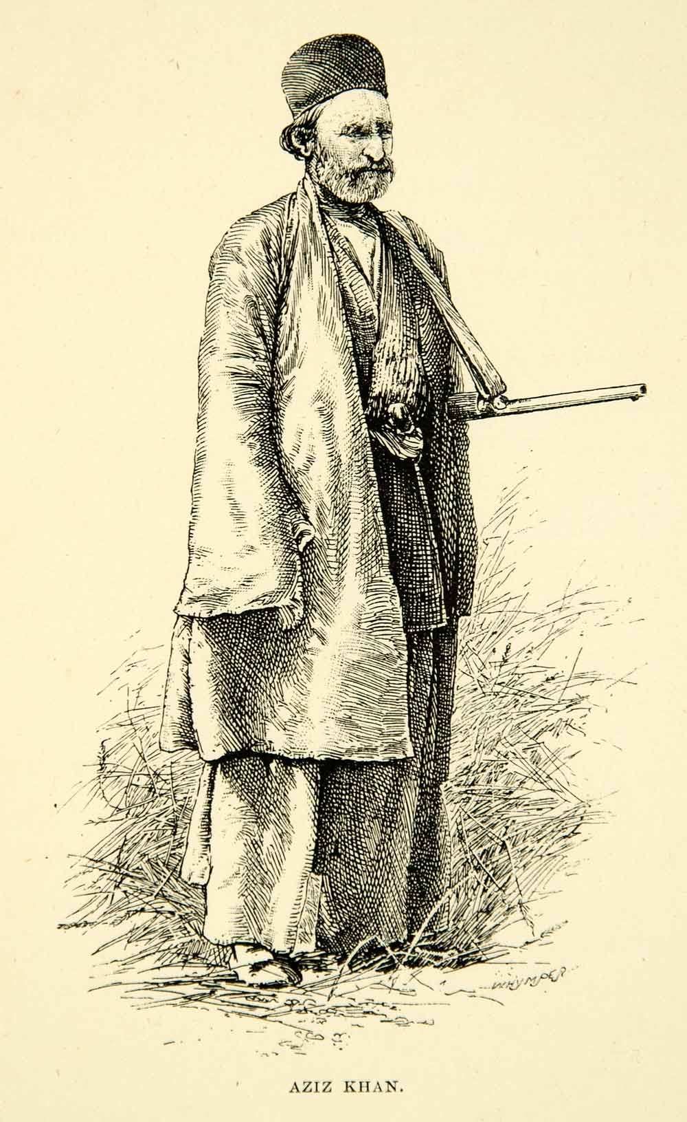 This is an original 1891 black and white wood engraving of a Middle Eastern man named Aziz Khan.