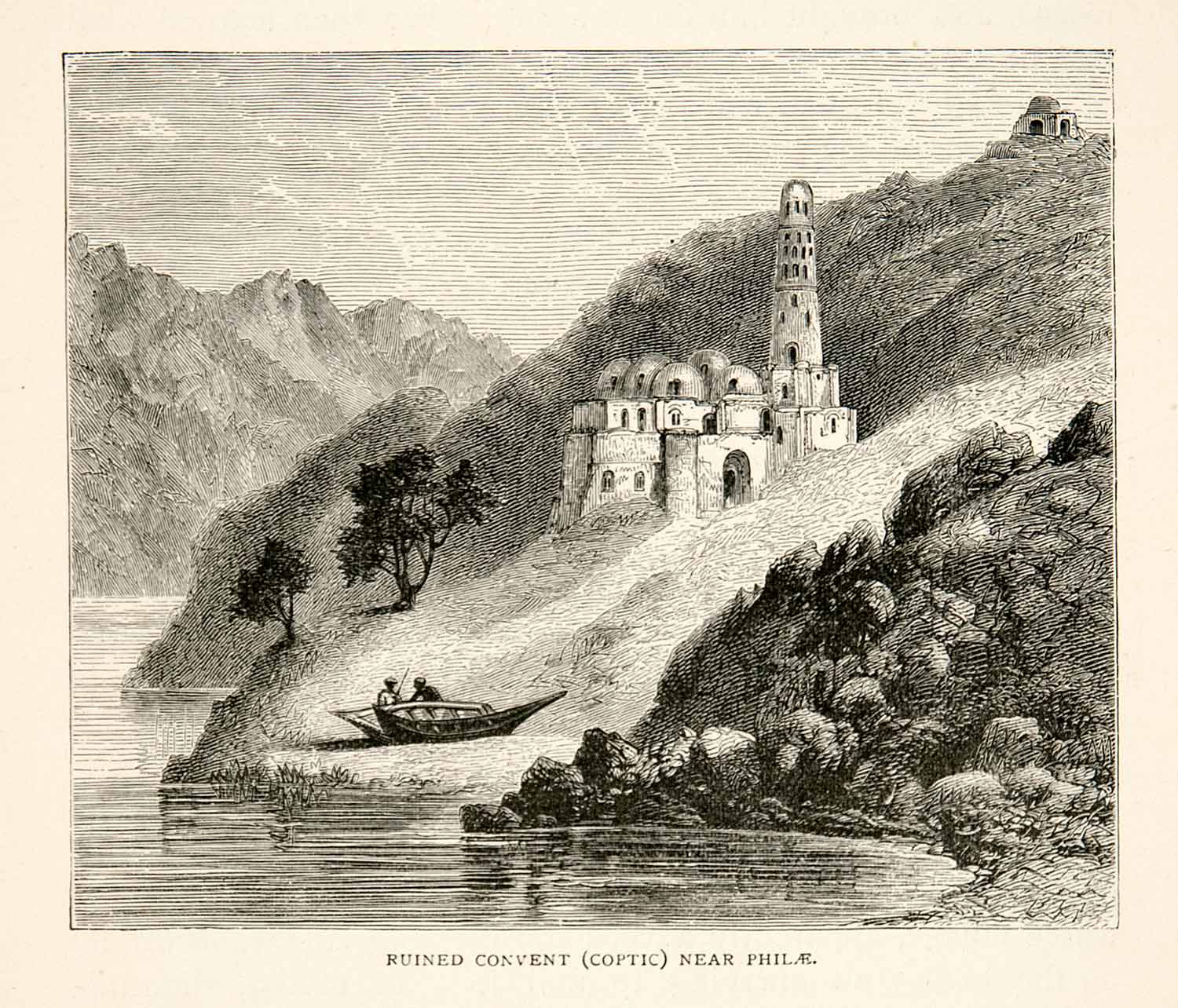 This is an original 1891 black and white in-text wood engraving of a ruined convent, located near Philae, Egypt.