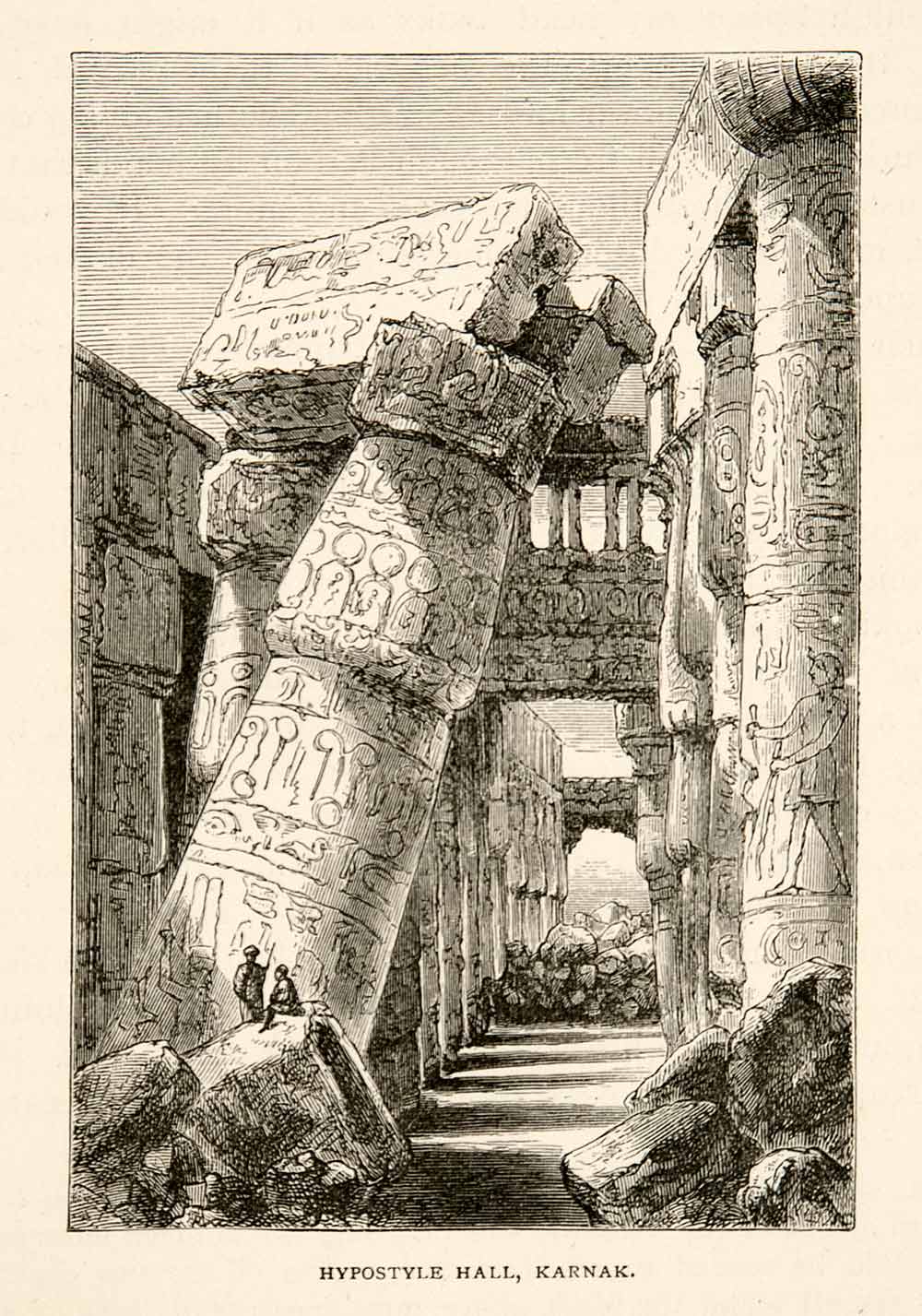 This is an original 1891 black and white in-text wood engraving of the Great Hypostyle Hall of the Karnak Temple Complex, located near Luxor (ancient Thebes), Egypt.