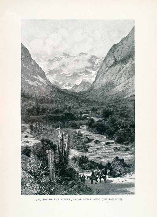 This is an original 1891 black and white wood engraving of the Juncal and Blanco Rivers which come together to form the Aconcagua River.