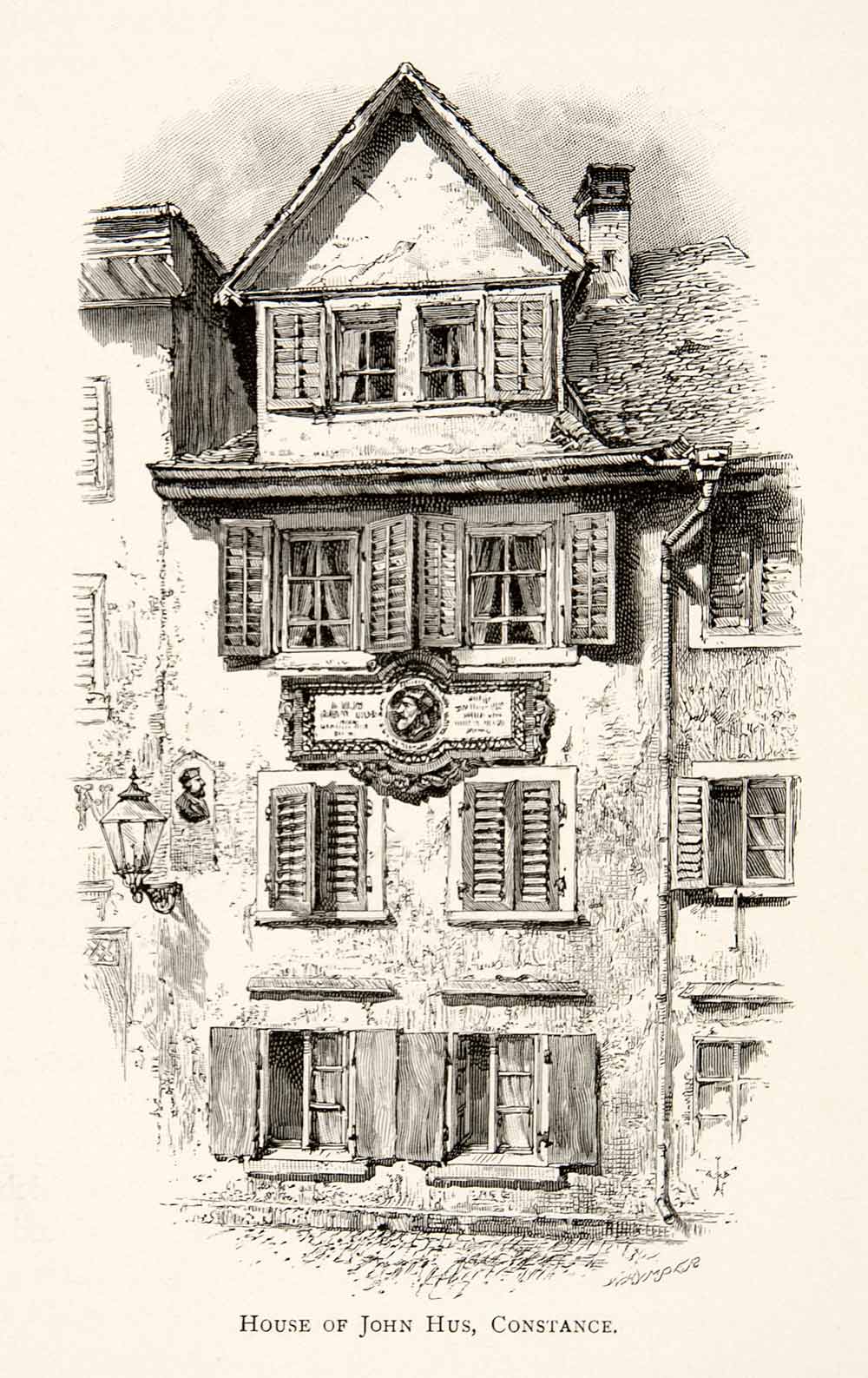 This is an original 1891 black and white in-text wood engraving of the John Hus's House in Constance, Switzerland. John Hus (1369-1415) was Czech priest, reformer, philosopher, and master at Charles University in Prague, Czech Republic. He is considered to be the first Church reformer.