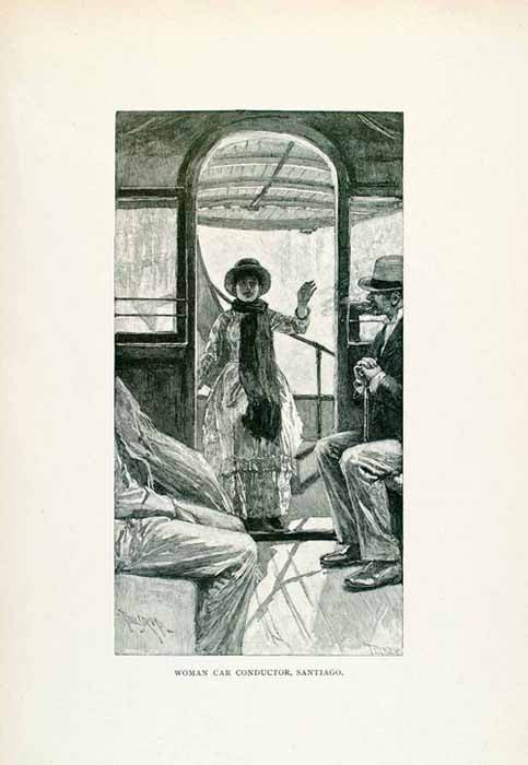 This is an original 1891 black and white wood engraving of a woman conductor with her straw hat, white apron, and money bag on the horsecar or horse-drawn tram in Santiago, Chile.