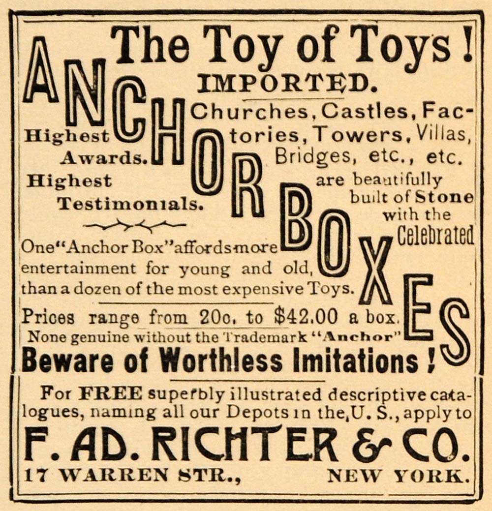 This is a small original 1892 black and white print ad for Anchor Boxes, imported toys of churches, castles, factories, towers, villas, bridges and more. This product line is from F. AD. Richter & Company, located at 17 Warren Street in New York.