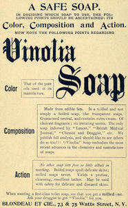 This is an original 1892 color print ad for the Vinolia Soap from Blondeau ET CIE located at 73 & 75 Watts Street, New York.
