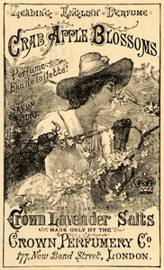 This is an excellent small original 1892 black and white print ad promoting the Crab Apple Blossoms Perfume Eau de Toilette and Crown Lavender Salts from Crown Perfumery Company located at 177 New Bond Street, London, Massachusetts.