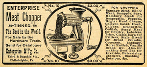 This is a small original 1892 black and white print ad for the Enterprise Manufacturing Company of Third & Dauphin Streets in Philadelphia, Pennsylvania. This ad features their Enterprise Meat Chopper and grinder.