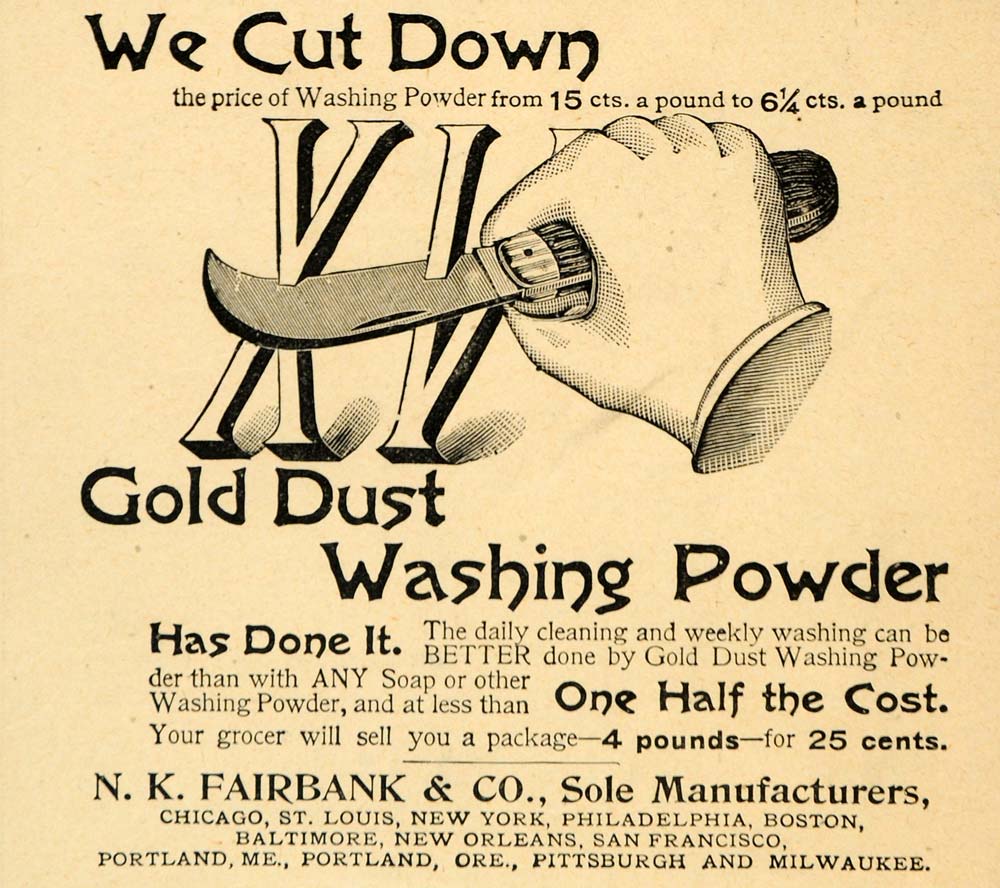 After American chemist James Boyce refined the ability to isolate and remove hydrogenated oils from plants, mainly cottonseed, for use in non-toxic soap, he became the Supervising Chemist for the Fairbank Company. Together, the Fairbank Company and Boyce collaborated to create the Gold Dust Washing Powder formula, which was first introduced around 1889. Prior to this product, laundry was done with a bar of soap and a washboard.