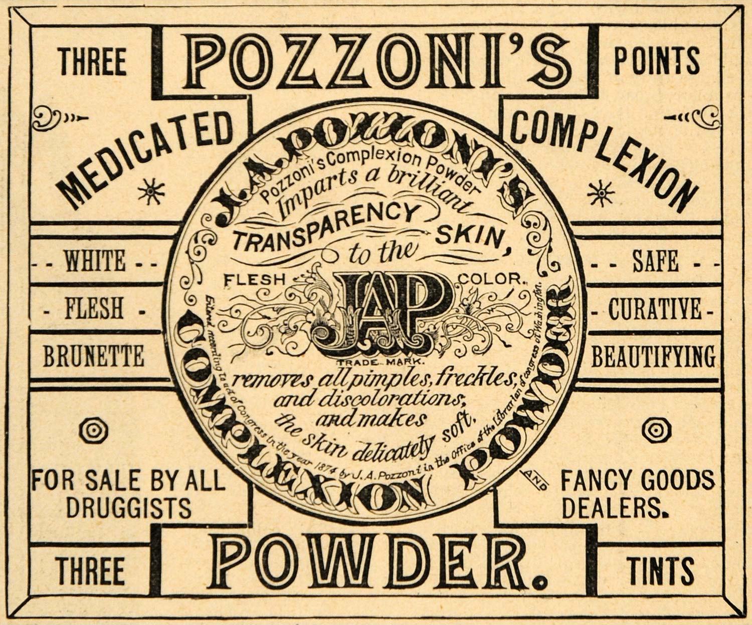 This is an original 1892 black and white print ad for the J. A. Pozzoni's Complexion Powder.