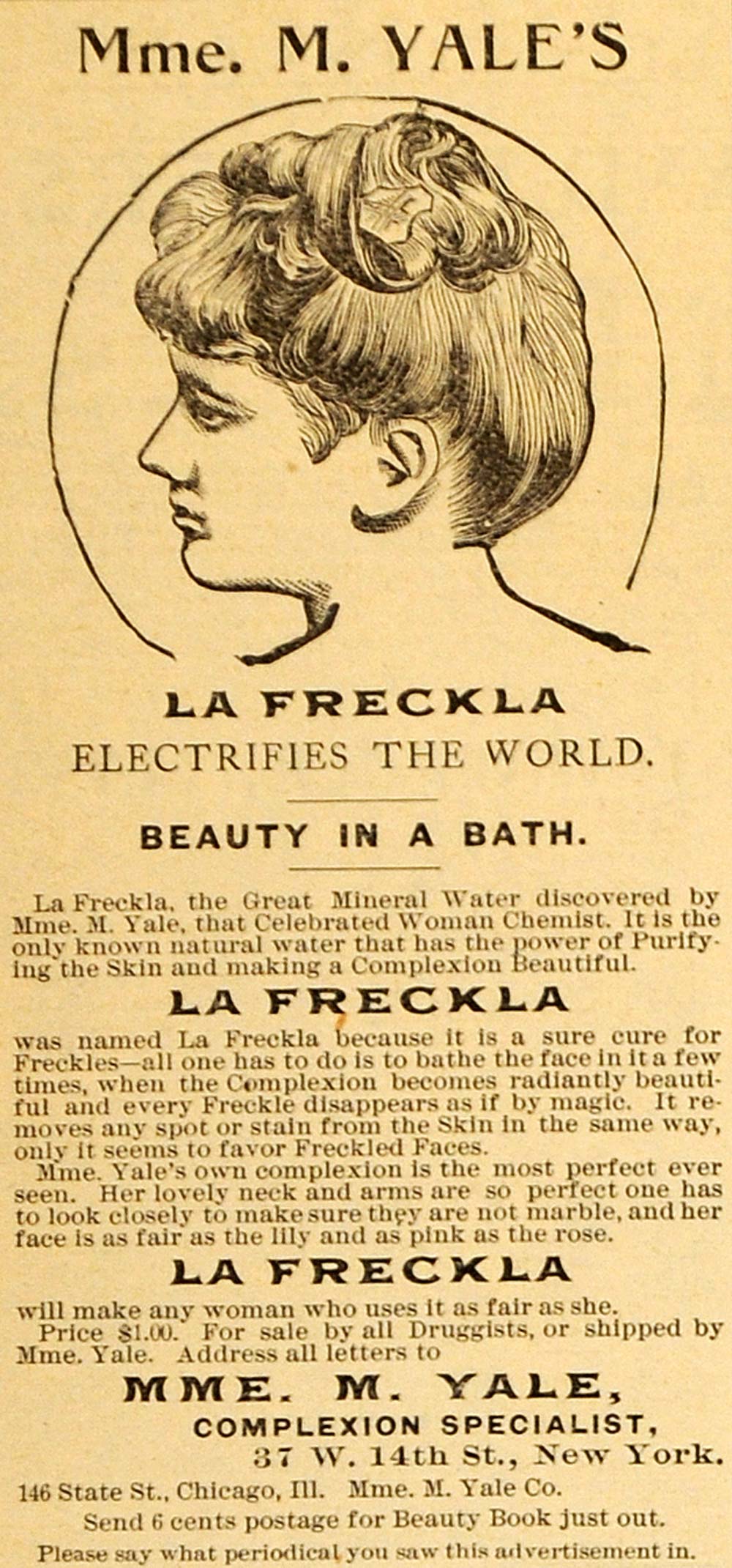This is an original 1892 black and white print ad for the Fleckla treating freckles from Mme. M. Yale, complexion specialist located at 37 W. 14th Street, New York.